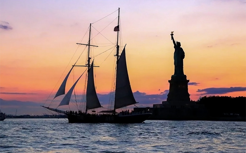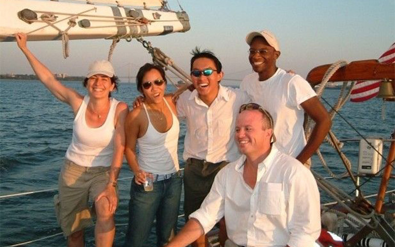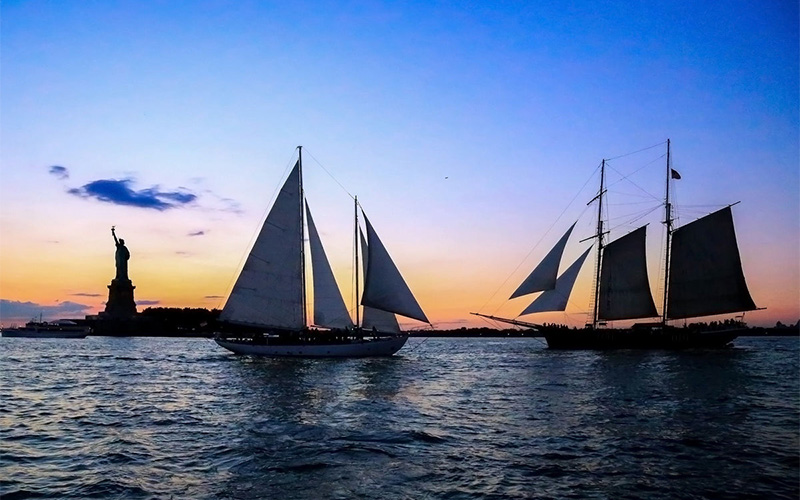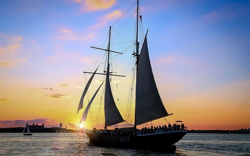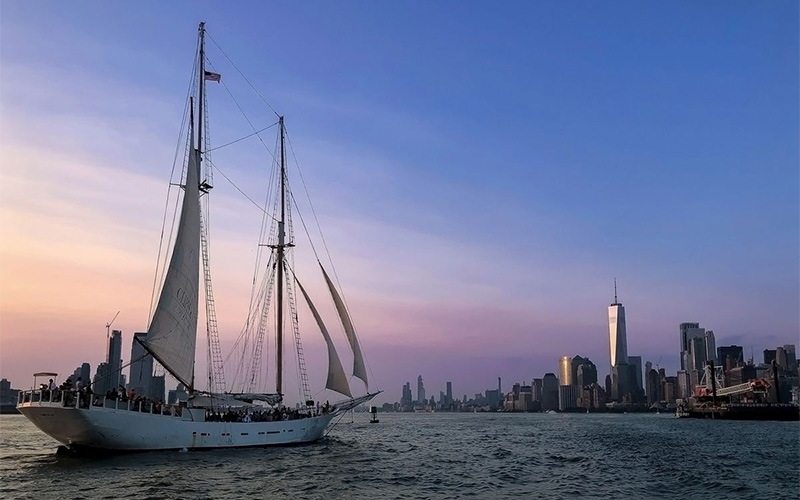 The Clipper City Tall Ship departs from Pier 17 at 89 South Street, NY, just south of the Brooklyn Bridge.
